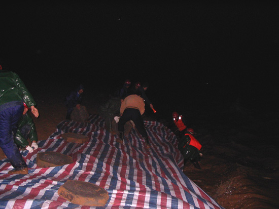 凭据以往的施工经验,我们很快启动了抢险应急预案。但由于情况卑劣,考验我们的时候到了,要发挥我们江西水建人“特别能刻苦、特别能战斗、特别能忍耐、特别能协作精神”的时候到了,我们与洪水抢时间、争进度,全体干群在漆黑的大堤上是一片穿梭奔驰的身影,各人齐心协力,手提肩扛,把一百多斤一块的混凝土预制块,一块块运到堤脚,此时项目部总工曾俊平掉臂6686体育的严寒,领导其它几名员工,奋身跃入水中,在水下铺设彩条布,而此时水下温度只有10℃左右,污浊6686体育一浪高过一浪拍打在他们的身上。各人顾不上严寒,顾不上疲劳,顾不上饥饿,衣服湿了又干,干了又湿,分不清是哪次被汗水照旧雨水弄湿的,在微弱的手电光照亮下铺设了一条又一条彩布条,码起了一道又一道沙包小堤。经过各人的紧张奋战,终于几处险情获得了控制,比及我们在忙碌中回过神来时,已经是越日的凌晨三点多钟,尽管各人拖着一副疲惫不堪的泥身子,但各人脸上装满了满意和胜利的微笑,王总此时饱含真情地对各人说了一声:“各人真的辛苦了,谢谢各人!”走在回家的路上,我正好与项目总工曾俊平走在一起,我看到他满身湿漉漉的,我体贴的问他在水中冷吗?他笑笑说道:“这是要害时刻,再冷也要下”。他旁边的同事告诉我,他是从下午三点钟就一直在水里做事直到适才,整整在水中浸泡了十二个小时。我们加入抢险的同志被曾俊平这种不怕困难、不畏艰险、掉臂个人安危、敢于刻苦的精神深深感动着,真是我们学习的好模范!
