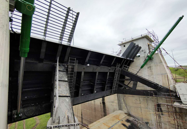 弧形闸门由3片门叶组成,重约70多吨。第一孔闸门的顺利提升,鼓舞了项目全体人员的士气,坚定了各人众志成城高质量完成项目的决心。