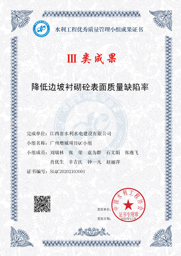 其中:廖坊灌区QC小组编写的《减小顶管施工轴线偏差值》获I类结果奖、广州番禺项目QC小组编写的《提高泵站混凝土外观质量及格率》获I类结果奖、广州增城项目QC小组编写的《降低边坡衬砌砼外貌质量缺陷率》获III类结果奖。