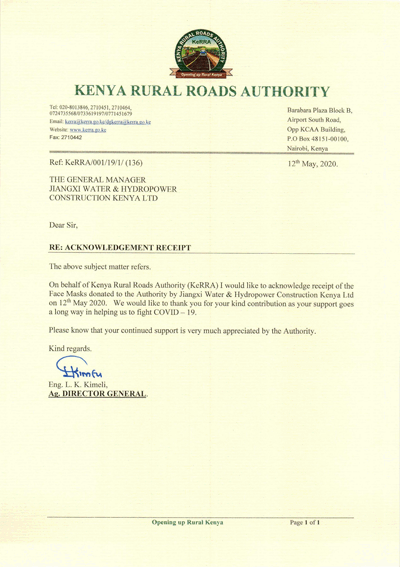 收到来自江西水建捐赠的防疫物资后,肯尼亚乡村公路局局长由衷地体现谢谢,并向肯尼亚分公司写了一封谢谢信,他在信中体现:“江西水建友好慷慨的捐赠,将为我们对抗新冠肺炎疫情提供久远的支持,肯尼亚乡村公路局对此深表谢谢。”